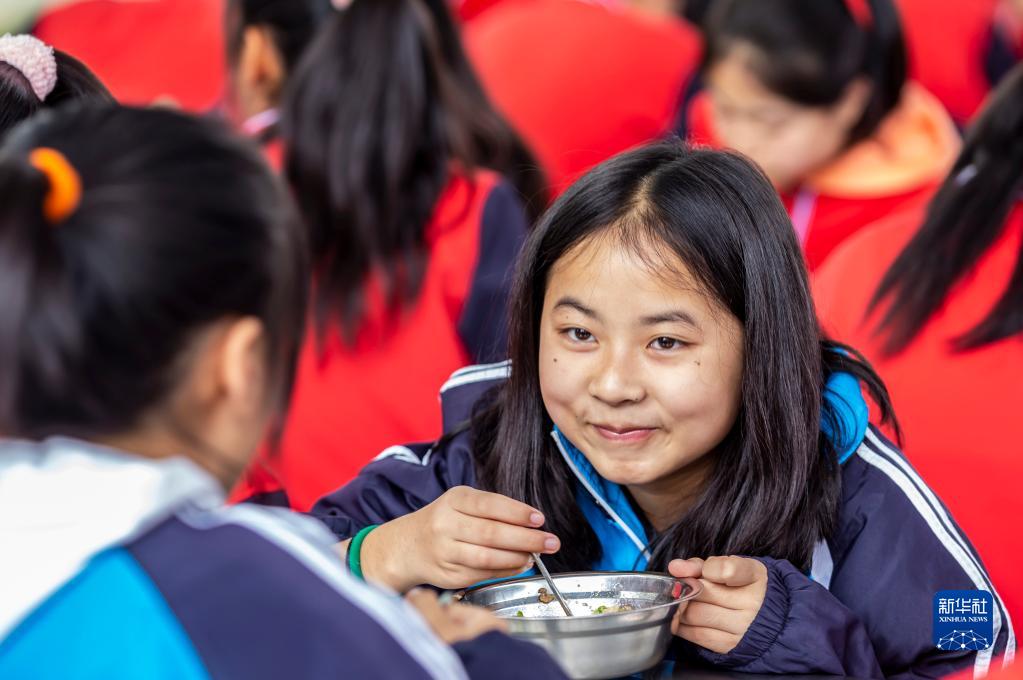 10月12日,在贵州省遵义市绥阳县风华镇中心学校食堂,学生在吃营养餐。新华社发(范晖 摄)