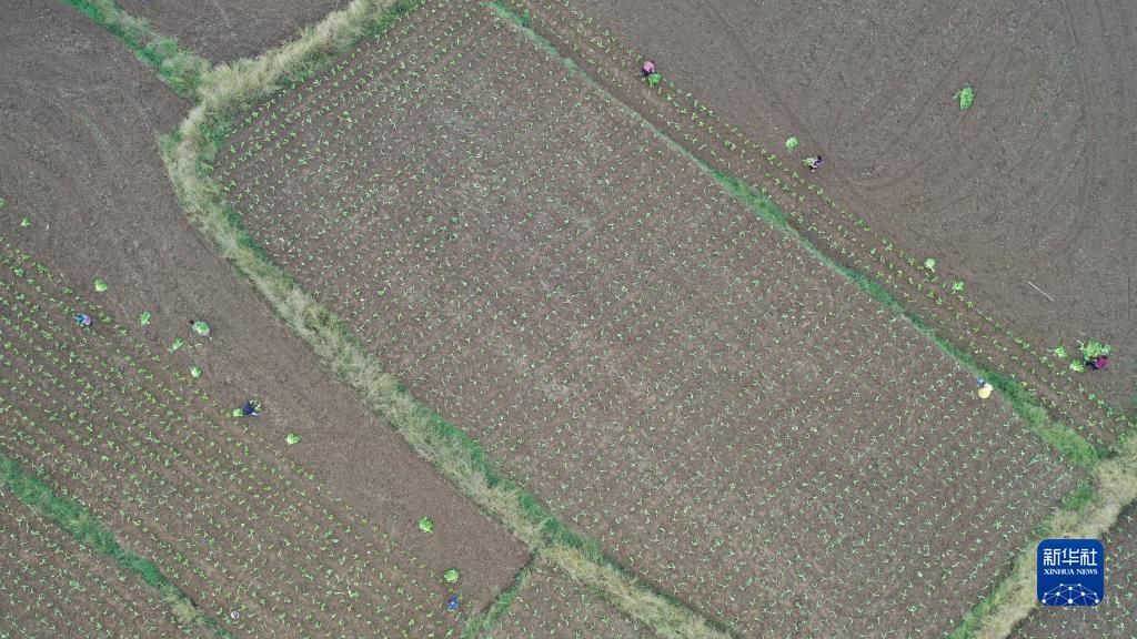 10月13日,在贵州省遵义市绥阳县风华镇银堡坝区,村民在移栽儿菜(无人机照片)。新华社记者 杨楹 摄