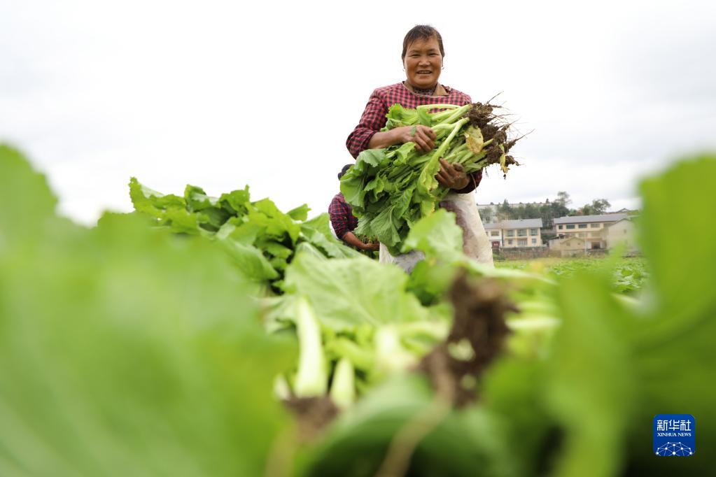 10月13日,村民在贵州省遵义市绥阳县风华镇银堡村供港澳蔬菜基地装载儿菜苗。新华社发(李艳 摄)