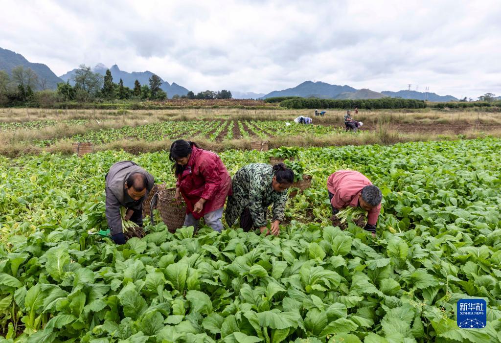 10月13日,村民在贵州省遵义市绥阳县风华镇银堡村供港澳蔬菜基地选采儿菜苗。新华社发(范晖 摄)