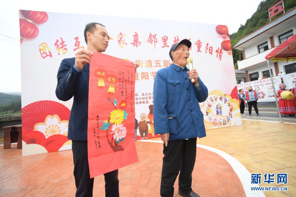 10月14日,在贵州省黔南布依族苗族自治州龙里县冠山街道办事处五新村养老互助中心,一名老人(右)在展示自己的贴画。新华社记者 杨楹 摄