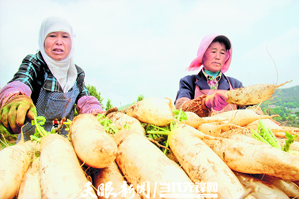 威宁自治县五里岗街道白岩社区蔬菜种植基地,菜农在采收白萝卜。陈武帅 摄