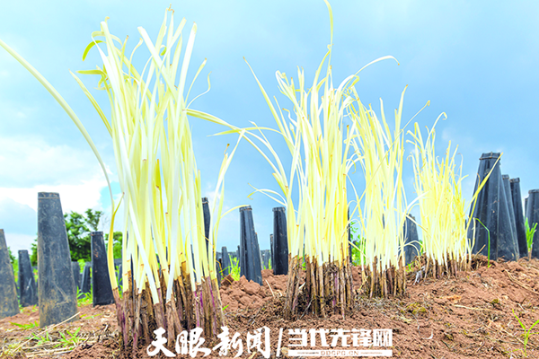 西秀区狗场屯村蔬菜种植基地种植的韭菜通过套筒技术脱去叶绿素变成金黄色的韭黄。高廷江 摄