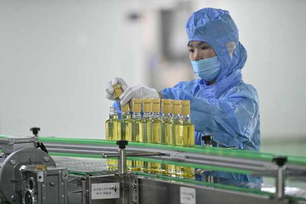 2021年10月13日,在贵州省从江县一家煨酒企业车间,工人正在分装包装成品煨酒。(吴德军 摄)