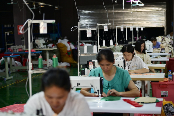 2021年7月16日,在贵州省从江县美娥易地扶贫搬迁安置点制衣厂内,就业的搬迁群众在工作。(吴德军 摄)
