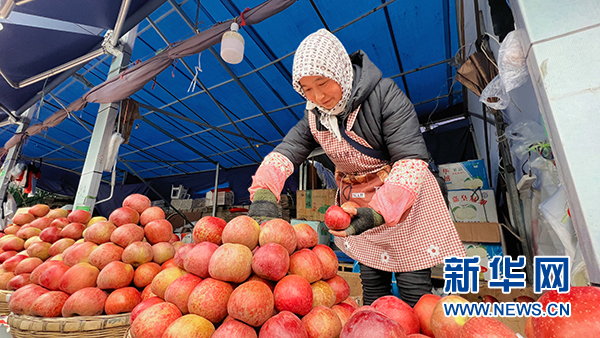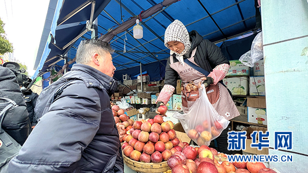 苹果摊上,摊主正为顾客挑选苹果。新华网 蔡连素 摄