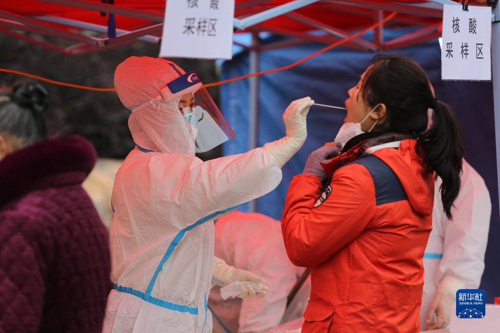 1月28日,在贵州省安顺市西秀区北街街道前进社区一临时核酸检测点,医务人员对居民进行核酸取样。新华社发(程洪凯 摄)
