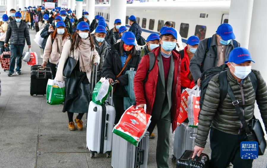 2月8日,返岗务工人员在遵义站站台等候上车。新华社记者 杨文斌 摄