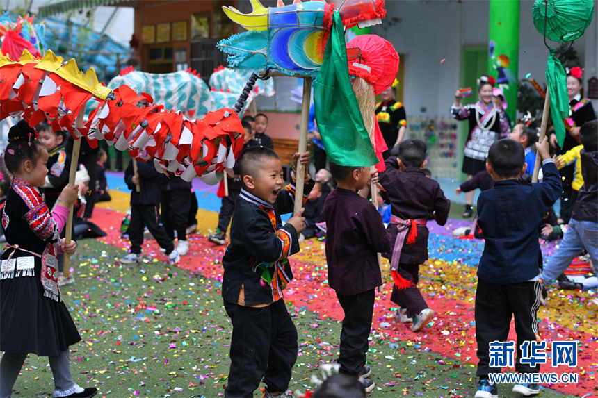 4月14日,在贵州省黔东南苗族侗族自治州台江县城关第二幼儿园展示舞龙嘘花的小朋友。新华网发(欧阳光林 摄)