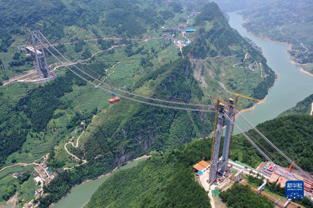 第一节钢桁梁正在进行吊装(6月28日摄,无人机照片)。新华社记者 刘续 摄