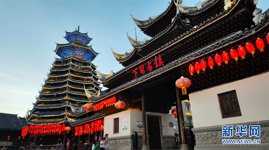 下司古镇的苗侗风格的牌楼和鼓楼。新华网 卢志佳 摄