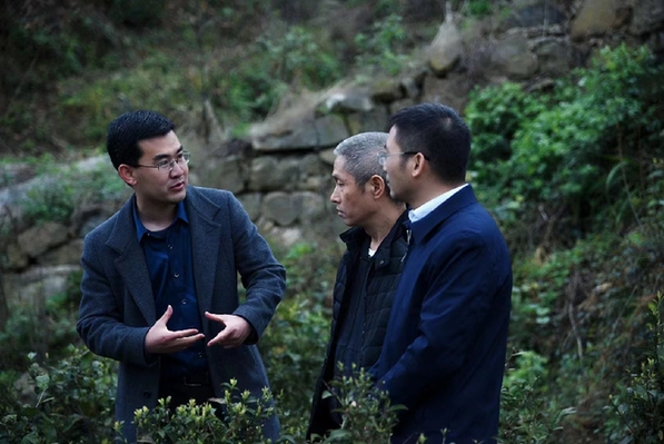 新华社驻阡工作队队员、大坪村驻村第一书记刘坤(左一)在调研产业发展。