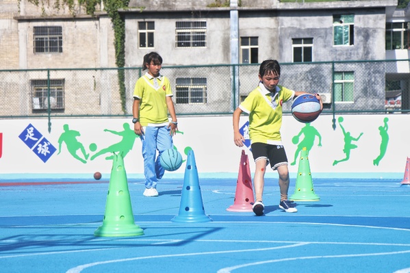 “足球、乒乓球、篮球都会了。”五年级2班的赵祖印在还未有楼顶操场之前,对体育课的印象仅仅停留在自由活动上,现在她不仅爱上了运动,每天放学还要坚持练习1个多小时篮球才回家。