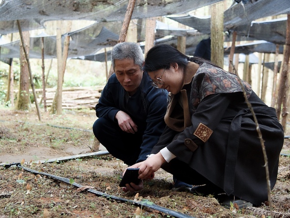 新华社驻阡工作队队员、枫香仡佬族侗族乡党委副书记喻翩一向前来调研的领导介绍羊肚菌长势。