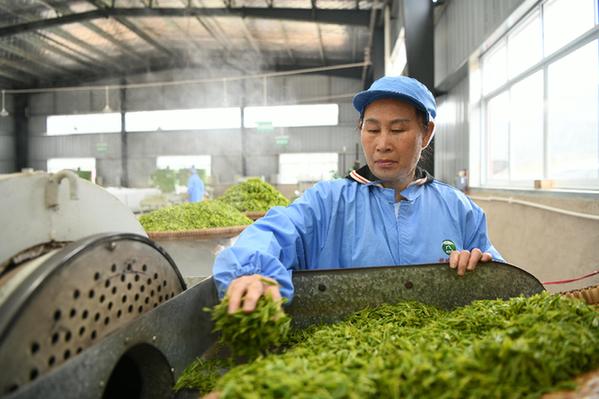 在贵州省凯里市碧波镇王义村,一名工人在茶叶生产车间制茶。(杨仁海 摄)