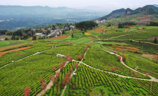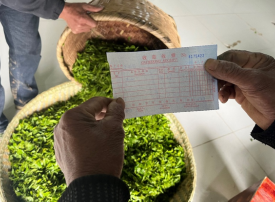 在贵州省铜仁市石阡县的国家现代农业产业园里,茶农们三五成群,背着茶篓,双手翻飞,抢摘今年的“雨前茶”。经过一上午的辛勤劳作,70岁的吴明富和妹妹一起采了5.9公斤茶青。在茶山下石阡县苔茶集团设立的茶青集中收购点,工作人员评定吴明富采摘的茶青都是“一芽二叶”,品质不错,便按15元一斤的价格收购,现场支付了吴明富177元的采茶费。