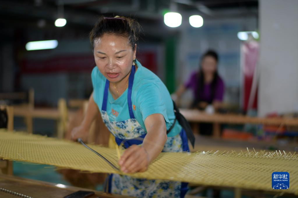 6月19日,村民在贵州省剑河县幸福社区帮扶车间加工藤编制品。