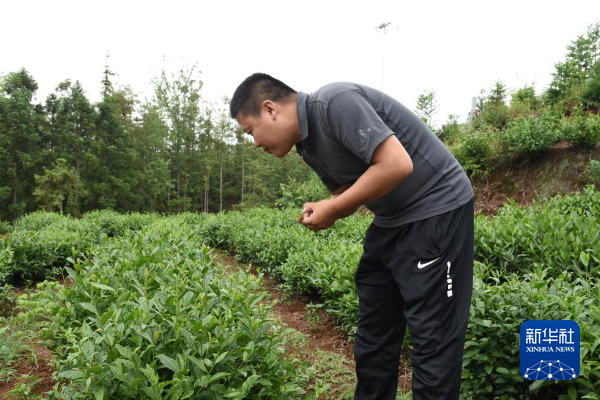 杨晓飞在查看长田村的茶叶生长情况。新华社记者 施钱贵 摄