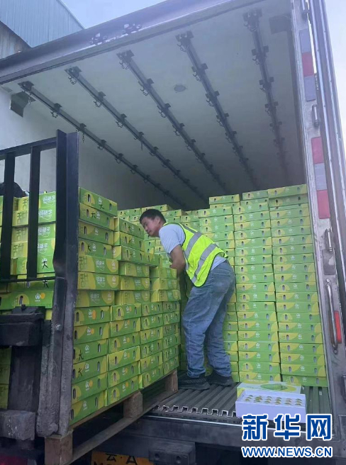6月18日,满载镇宁蜂糖李的冷链运输车抵达上海辉展果蔬市场,工人进行卸车操作。新华社发(受访者供图)