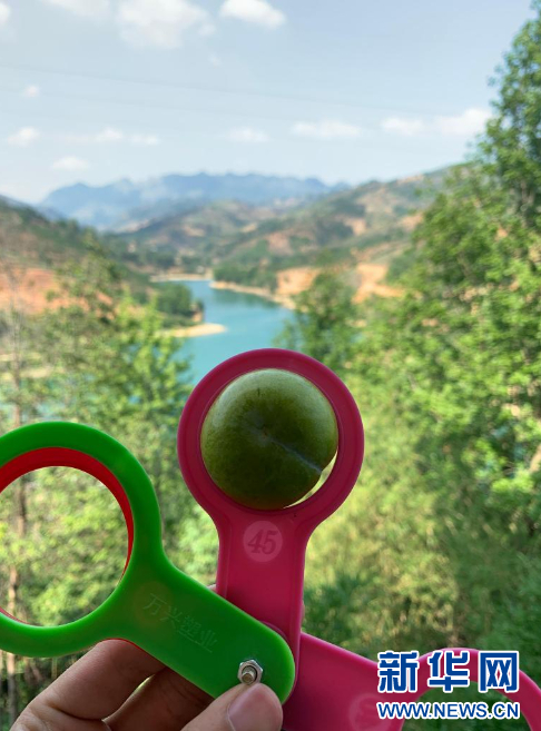 6月17日,村民展示筛选蜂糖李用的水果分级板。新华社记者 齐健 摄