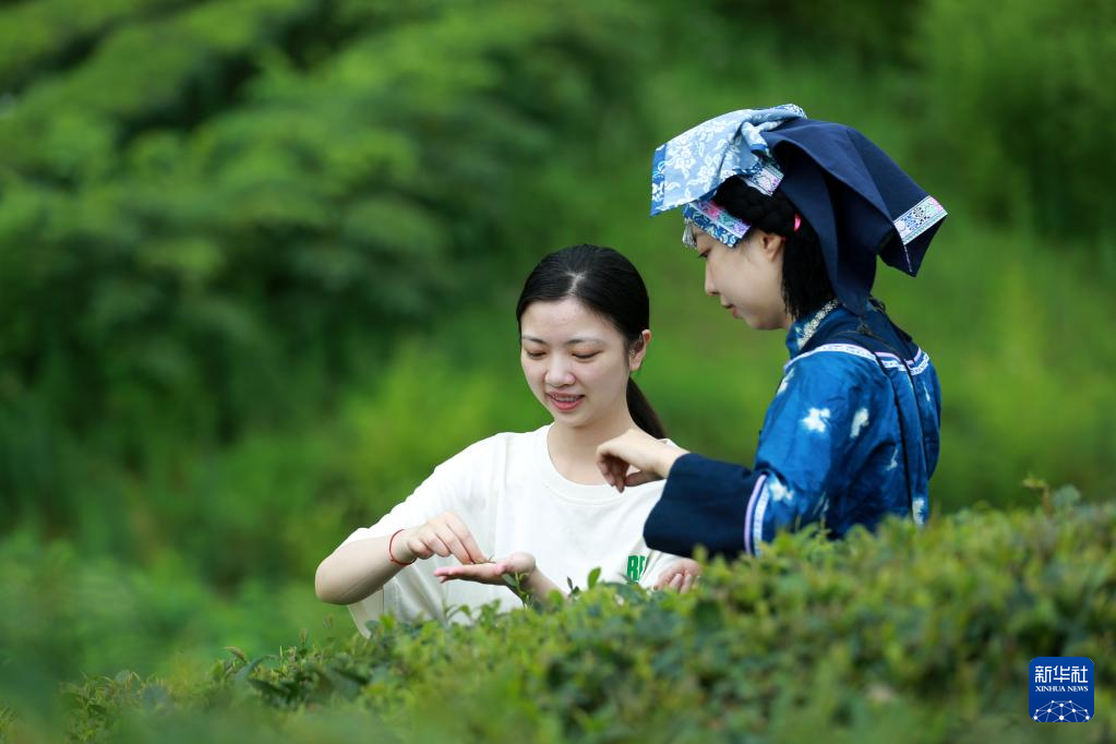 7月1日,游客在都匀市毛尖镇坪阳村茶山体验采茶。