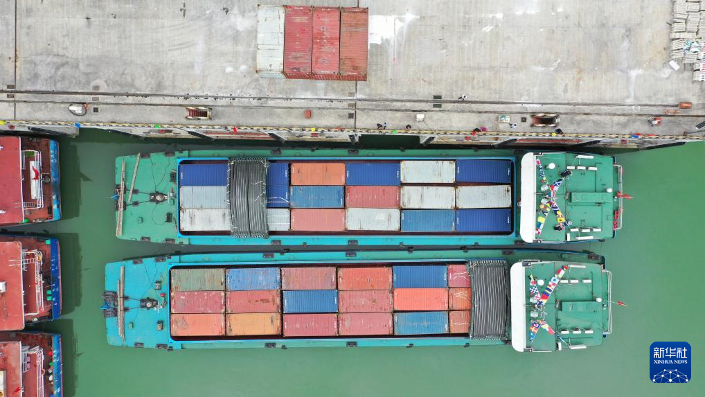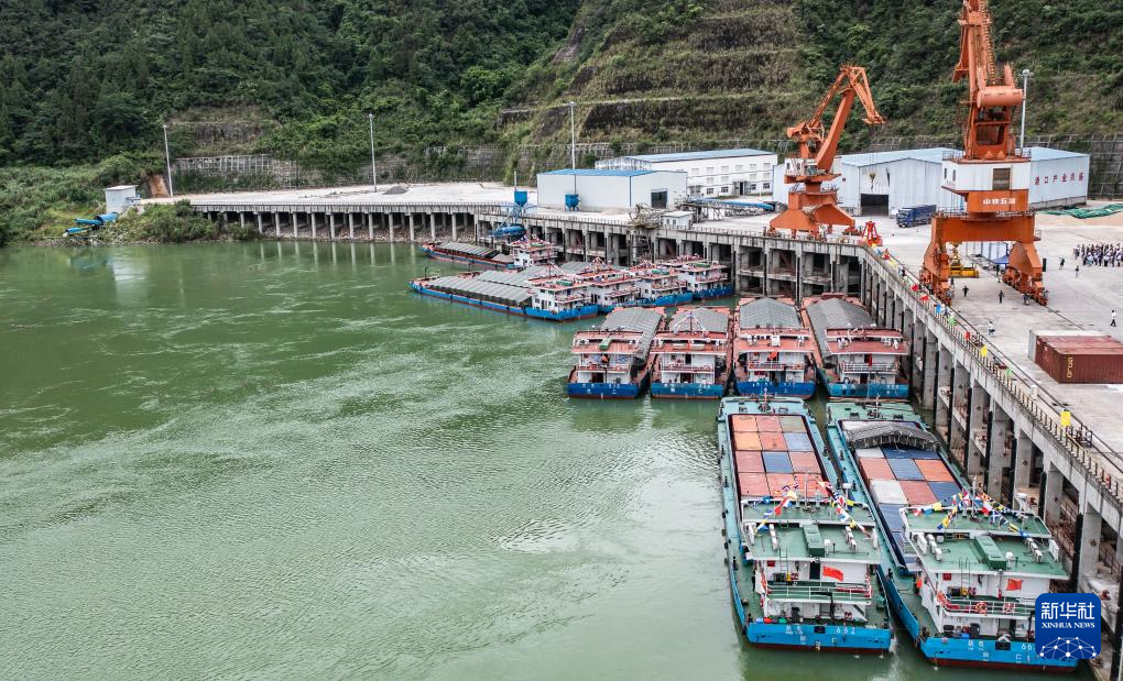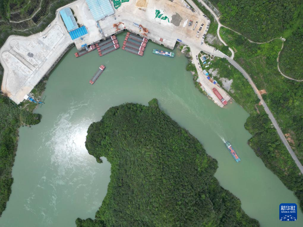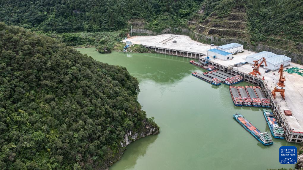 集装箱货轮在贵州省遵义市余庆县沙湾码头整装待发(7月14日摄,无人机照片)。新华社发(王杰 摄)