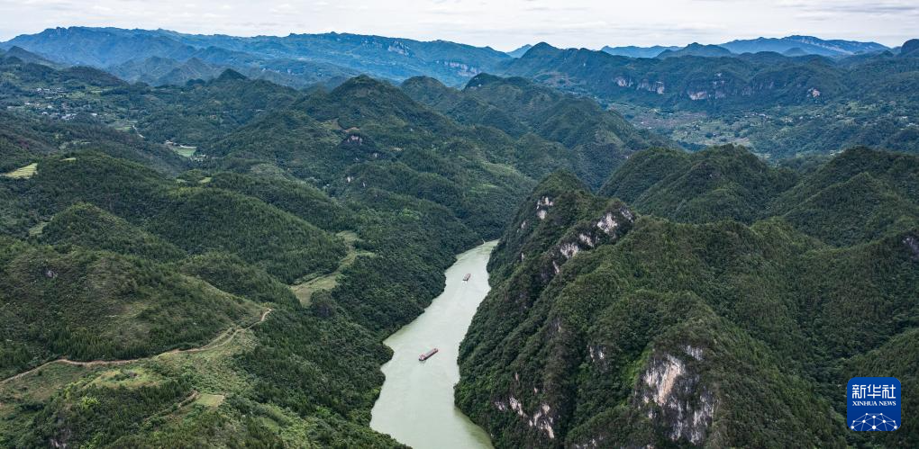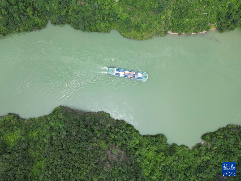 集装箱货轮从贵州省遵义市余庆县沙湾码头驶出,前往重庆涪陵黄旗港(7月14日摄,无人机照片)。新华社记者 陶亮 摄