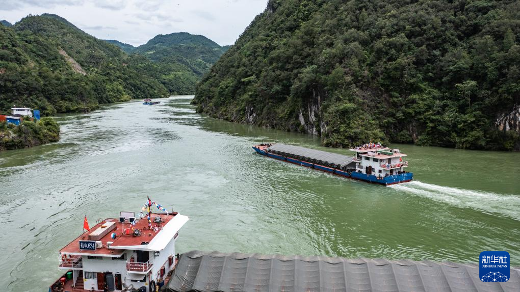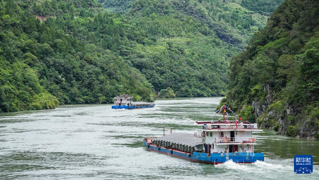 集装箱货轮从贵州省遵义市余庆县沙湾码头陆续驶出(7月14日摄,无人机照片)。新华社发(王杰 摄)