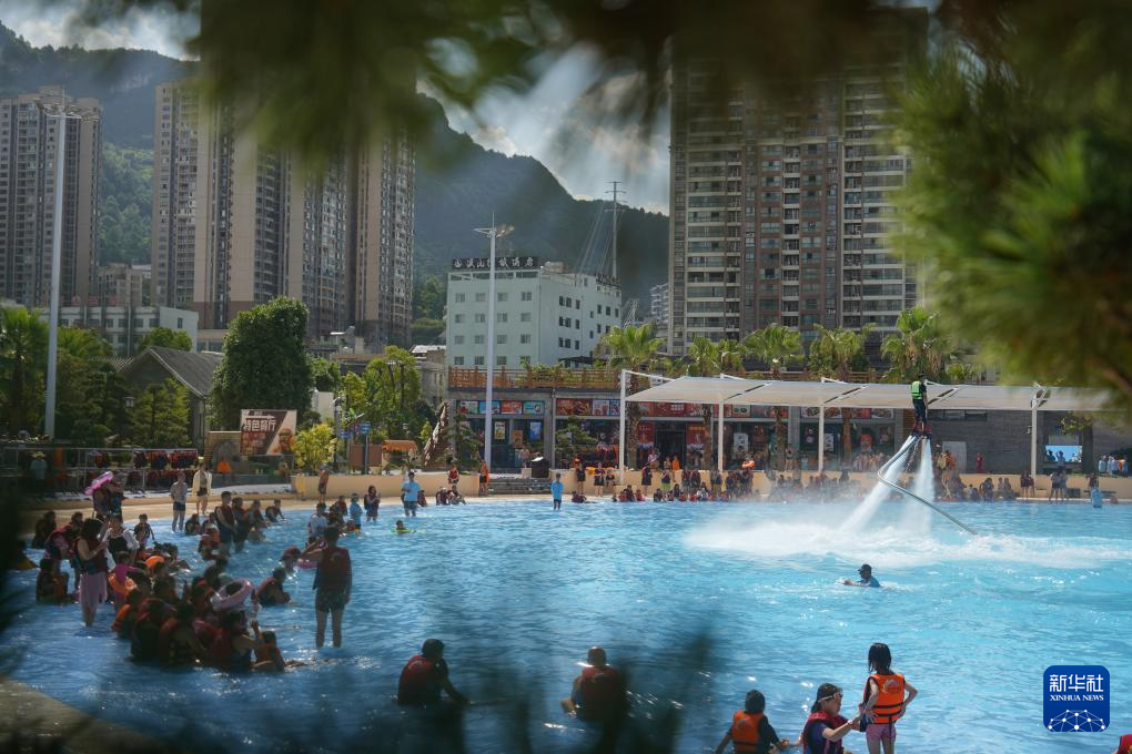 7月16日,游客在石阡古温泉休闲娱乐。新华社发(杨坤 摄)
