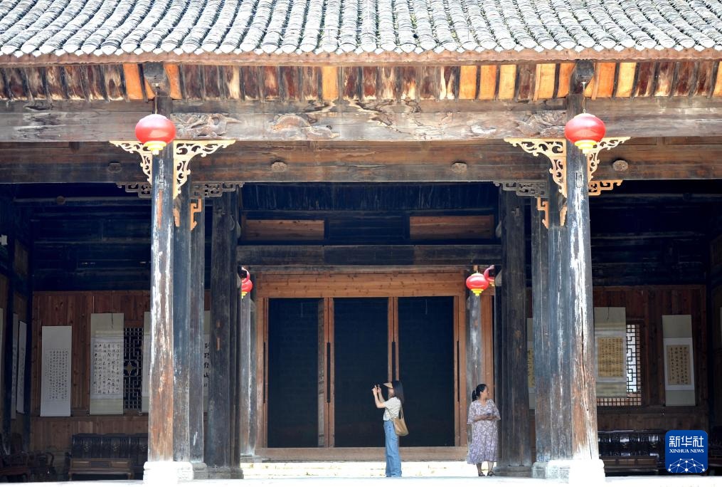 7月16日,游客在铜仁市石阡县万寿广场参观禹王宫古建筑群。新华社发(宁坚 摄)