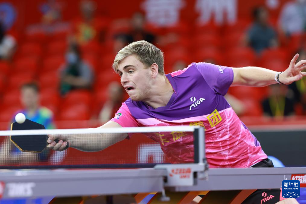 7月18日,乐旋体育集团队选手莫雷高德在比赛中回球,他以2比3不敌汕头明润队选手林高远。最终,汕头明润队以3比2战胜乐旋体育集团队。新华社记者 刘续 摄pagebreak