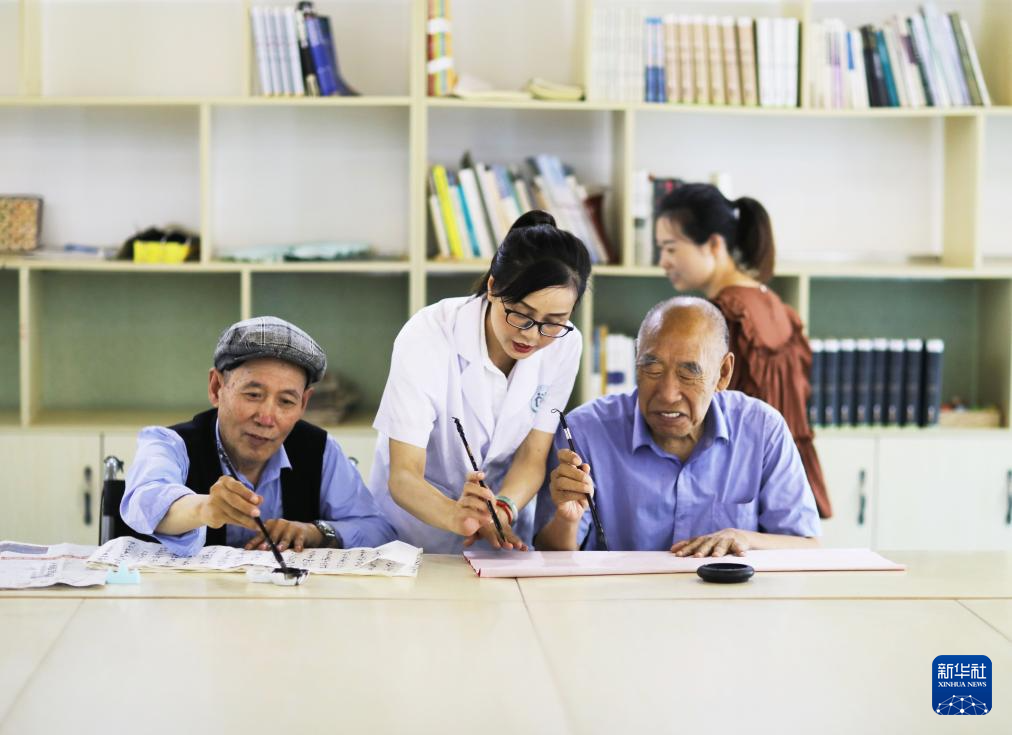7月20日,在赤水市长寿和庭康养中心,医护人员指导老人练习书法。