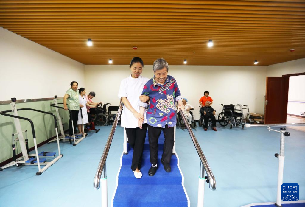 7月20日,在赤水市长寿和庭康养中心,老人在医护人员陪同下做腿部康复训练。新华社发(王长育摄)