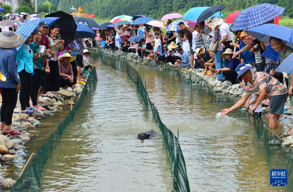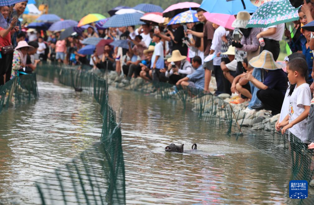 7月30日,在贵州省从江县刚边壮族乡香猪趣味运动会上,人们在观看香猪游泳比赛。新华社发(卢忠南 摄)