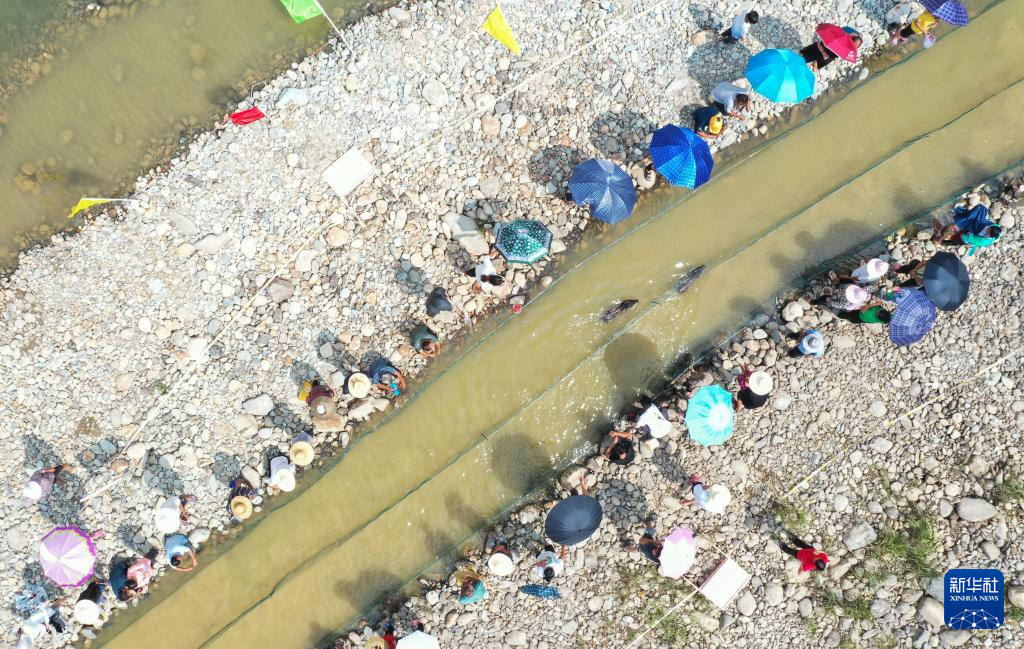 7月30日,在贵州省从江县刚边壮族乡香猪趣味运动会上,人们观看香猪游泳比赛(无人机照片)。
