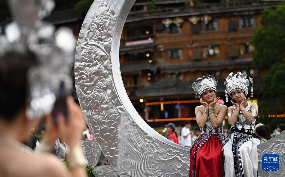 8月1日,游客在贵州省黔东南苗族侗族自治州雷山县西江千户苗寨景区游览拍照。新华社记者 杨楹 摄