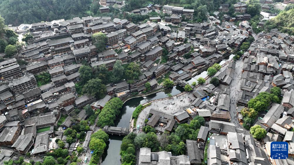 这是8月1日拍摄的贵州省黔东南苗族侗族自治州雷山县西江千户苗寨景区(无人机照片)。