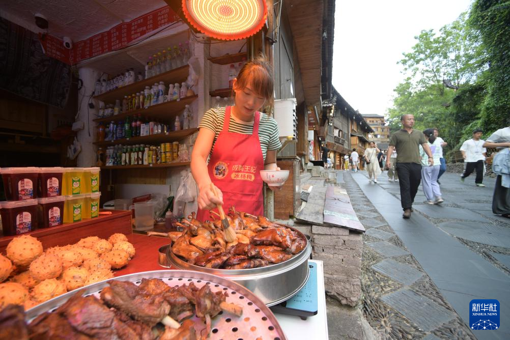 8月1日,一名店主在贵州省黔东南苗族侗族自治州雷山县西江千户苗寨景区准备食品。新华社记者 杨楹 摄pagebreak