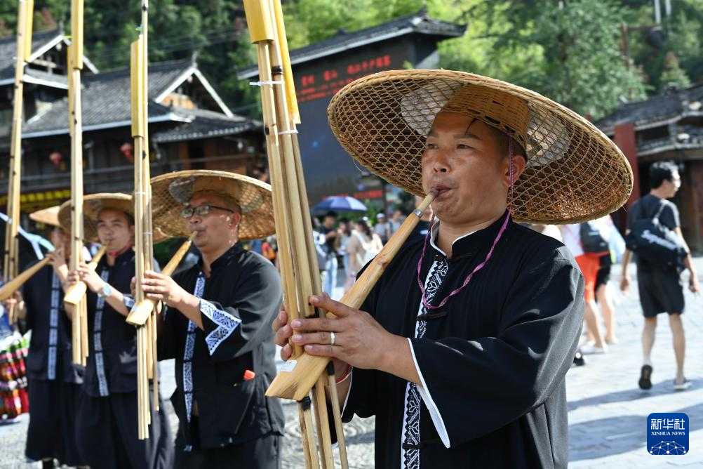 8月1日,苗族群众在贵州省黔东南苗族侗族自治州雷山县西江千户苗寨景区吹奏芦笙迎客。新华社记者 杨楹 摄pagebreak