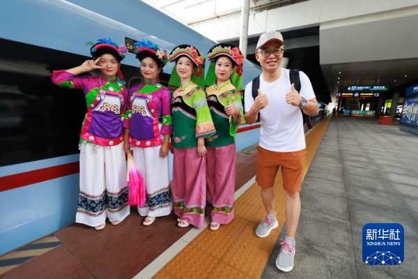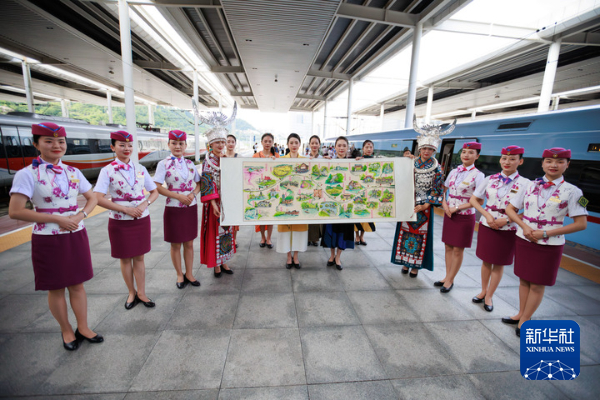 8月8日,身着少数民族特色服装的工作人员在D6155次列车旁迎接旅客。新华社记者 刘续 摄