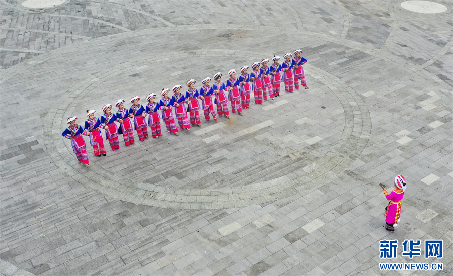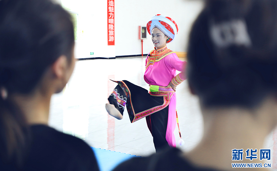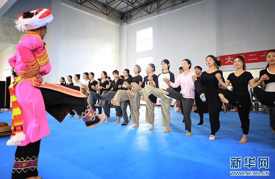 8月6日,文安梅在指导青年舞蹈演员跳阿妹戚托,她是阿妹戚托省级非遗传承人,也是阿妹戚托艺术团团长。新华网 卢志佳 摄pagebreakpagebreak