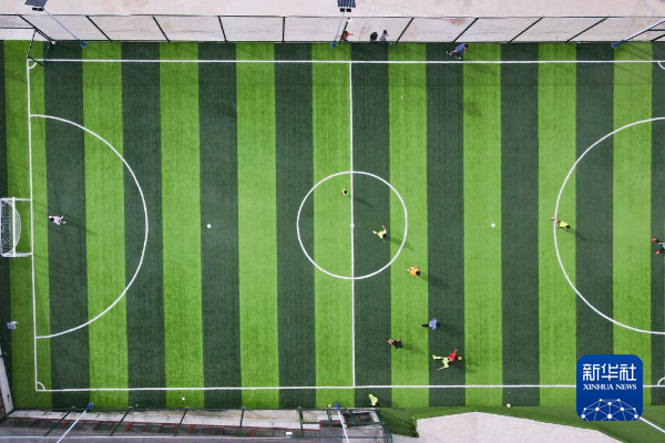 8月5日,辣子村小学男子足球队的队员在学校足球场踢球(无人机照片)。新华社记者 郑明鸿 摄