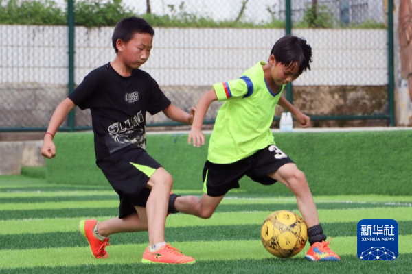 8月5日,辣子村小学男子足球队的队员在学校足球场踢球。新华社记者 郑明鸿 摄