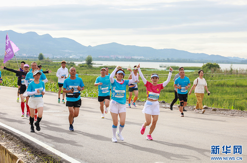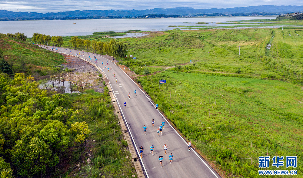8月13日,参赛选手们在草海湖畔奔跑。新华网发(周天贵 摄)pagebreak