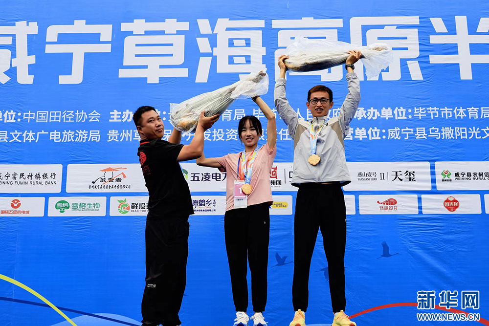 8月13日,男子、女子组冠军选手在领取奖品——威宁火腿。新华网发(杜雍 摄)