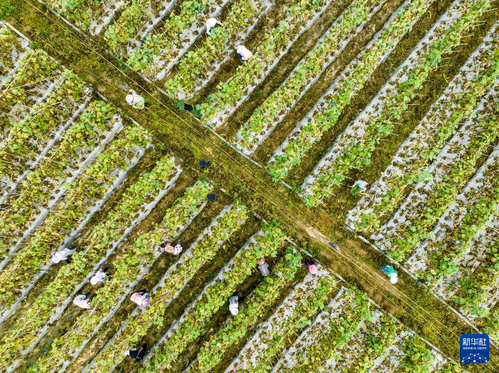 8月23日,农民在贵州省安顺市西秀区旧州镇浪塘村田间劳作(无人机照片)。