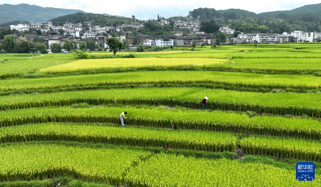 8月23日,农技人员在贵州省开阳县禾丰乡马头村田间查看水稻长势(无人机照片)。新华社发(袁福洪 摄)