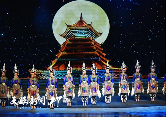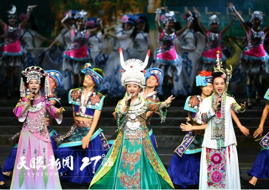 “高山好大,流水好长,芦笙大歌响起的贵州,就是我的家,来吧亲人来吧朋友,风雨阳光酿成了美酒,千杯才风流……”8月26日下午,融合苗族、布依族、彝族、水族、侗族等民族歌舞的篇章《最美是这里》拉开2023多彩贵州文化艺术节大幕,由阿幼朵、杨春念、郑涵月演唱的首个民族歌舞节目《欢迎贵客来我家》热情唱响。
