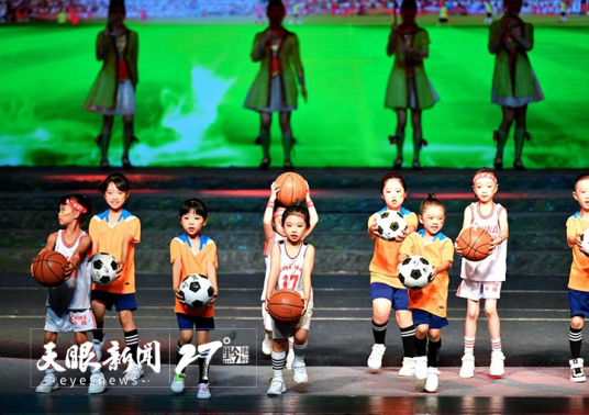 在侗族歌舞《绿水青山》中,一群侗族女孩手撑红伞从舞台边缓缓走向舞台,融入身着侗族盛装演唱的天籁之音《蝉之歌》队伍中,这首融合尚·马龙的音乐,与侗族大歌惊艳组合,舞台上载歌载舞的场面尤为感人,热情好客的贵州各民族围聚一起,“村BA小球迷”苗家小朋友玩起篮球,“村超小球迷”侗家小朋友踢起足球,动人的旋律,热情的贵州各民族同胞展现出讴歌新时代、奋进新征程的美好画面。