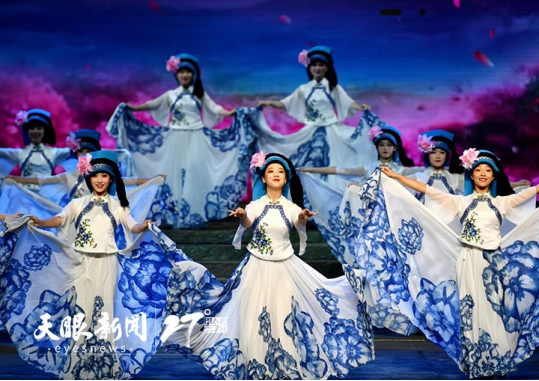 在随后的演出中,平静而温暖、美好而真挚的布依族舞蹈《好花红》在舞台上绽放,该节目以婉约的情感色彩,好似水稻田里劳作时无心哼出的熟稔曲调,表达出山水间宁静柔美和布依人民对恬淡生活的热爱;彝族歌舞《迎亲曲》,则表现了在迎亲路上彝族小伙姑娘们欢快地起舞歌唱,与热情、奔放的器乐表演共同营造出喜庆氛围,让观众感受到彝族人民生活的幸福与喜悦。水族歌舞《相思》,将水族姑娘绣马尾绣的场景搬上舞台,她们在悠悠扬扬的歌声里畅想幸福。